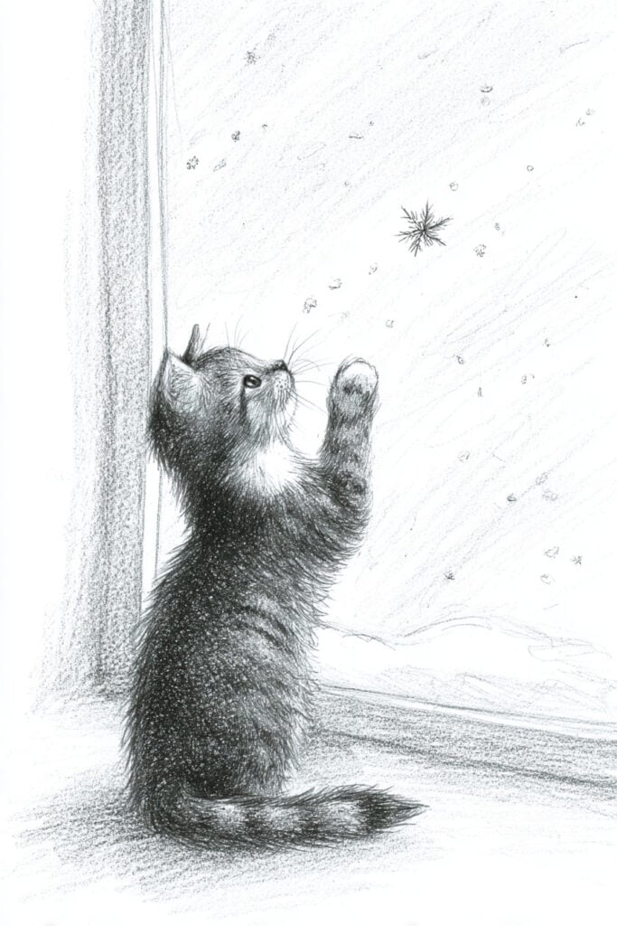 A cat sitting by a frosty window, one paw raised toward a drifting snowflake.