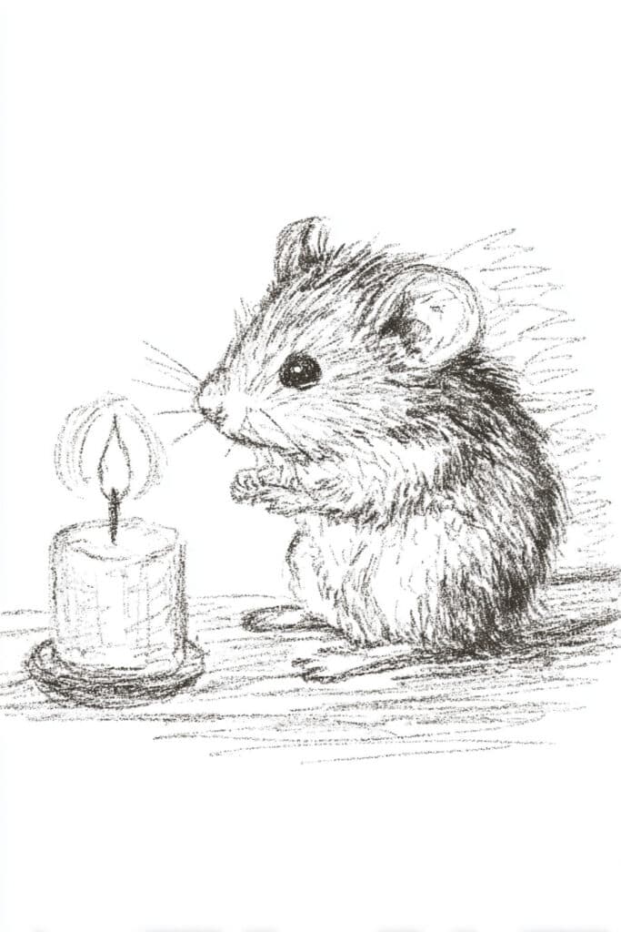 A tiny field mouse sitting beside a glowing candle, whiskers catching the warm golden light.