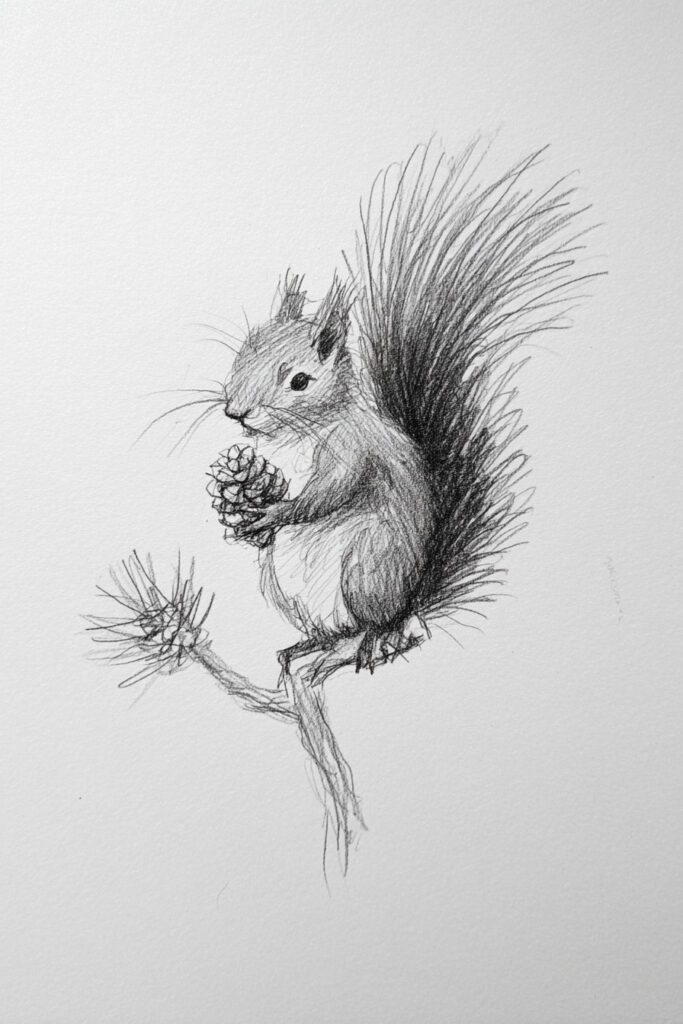 A squirrel perched on a branch, clutching a pinecone tightly with its fluffy tail swooped behind.