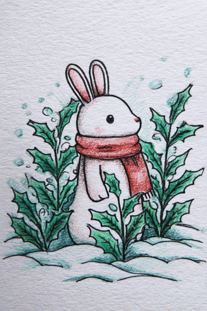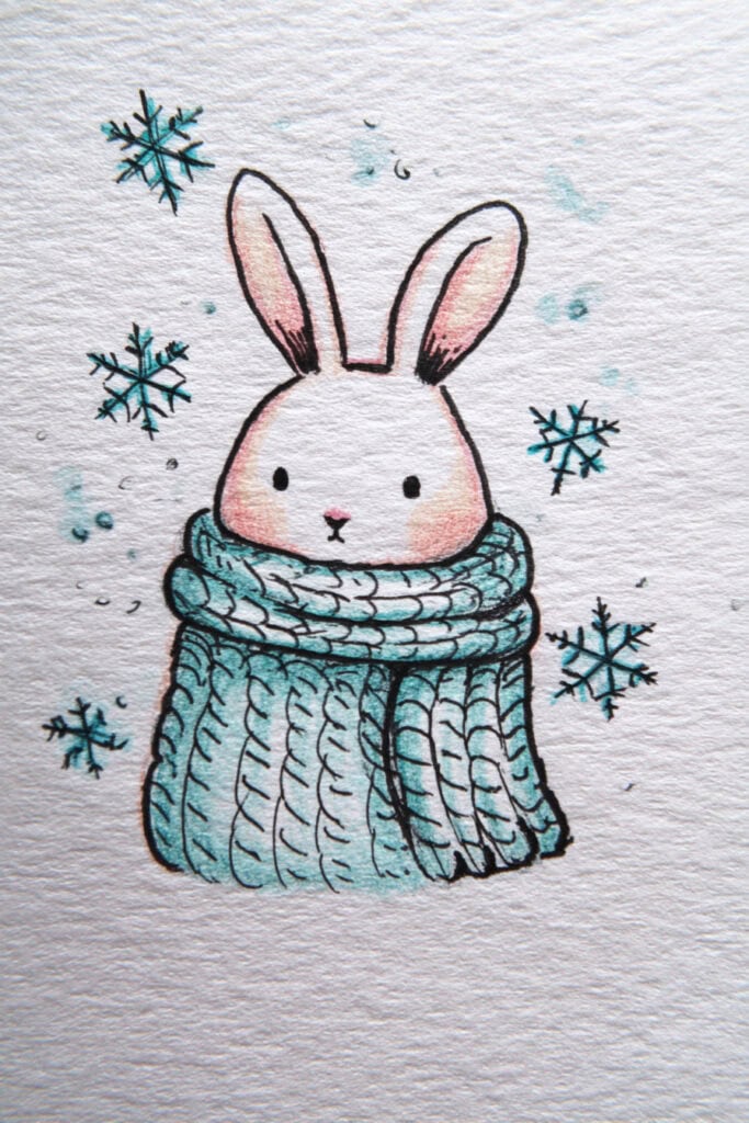 Bunny wrapped snugly in a chunky knit blanket with tiny snowflakes around. Drawing a wrapped-up bunny taught me about suggestion – you don’t need to show the whole body when it’s bundled up. Just the head, maybe some paws peeking out, and let the viewer’s brain fill in the rest.
