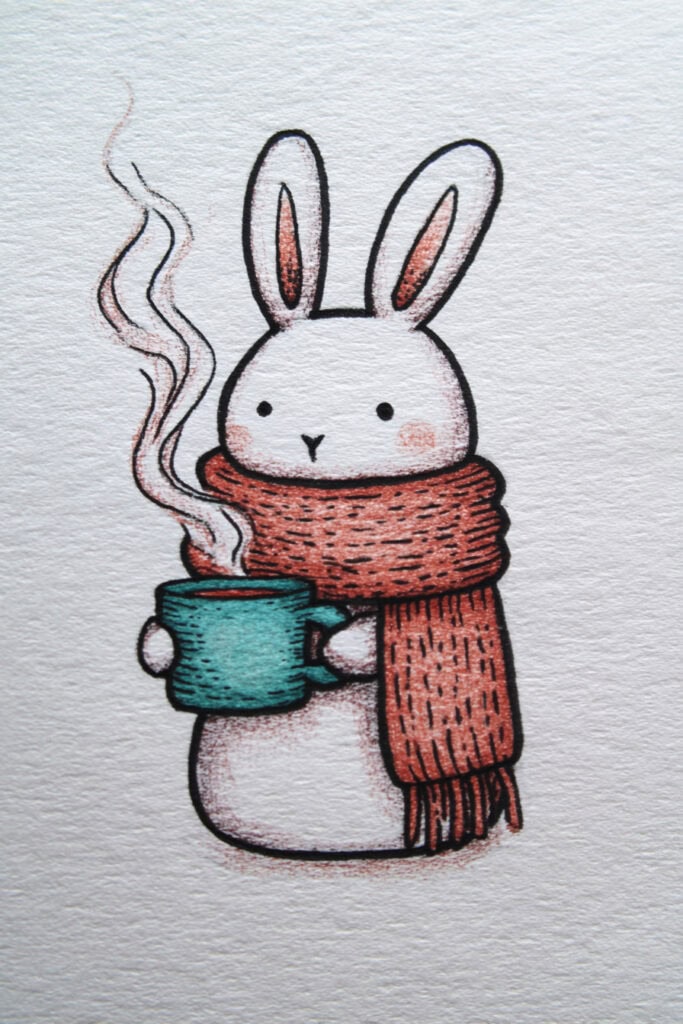Bunny holding a steaming mug of winter tea, wrapped in a chunky scarf. The steam rising from the mug is easy to suggest with a few wavy lines. The chunky scarf has nice big folds that are satisfying to draw.