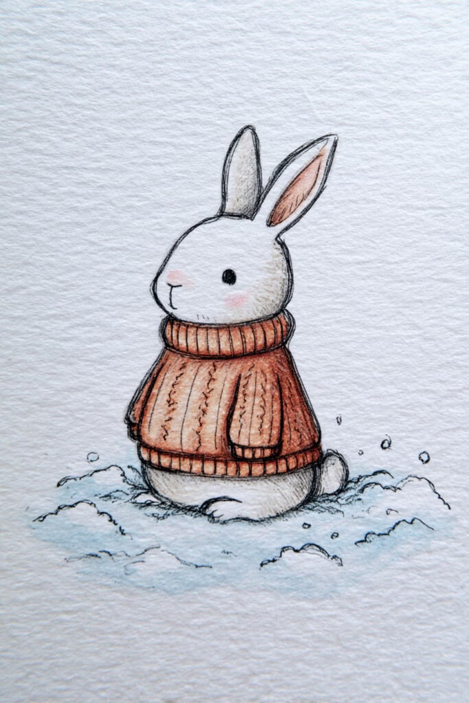 Bunny wearing a fuzzy knit sweater, sitting on snow-covered ground. The fuzzy texture of the sweater contrasts nicely with the bunny’s smooth fur. You can suggest “fuzzy” with a few loose, irregular lines rather than trying to render every fiber. Sometimes less detail reads as more texture.