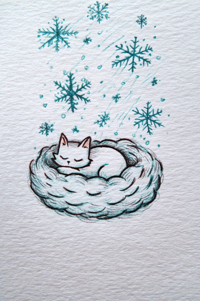 Negative space is your friend – You don’t need to fill every bit of space. Let the snow be white page. Let the gentle snowfall be just a few floating dots. Simplicity often beats detailed backgrounds in doodle work.