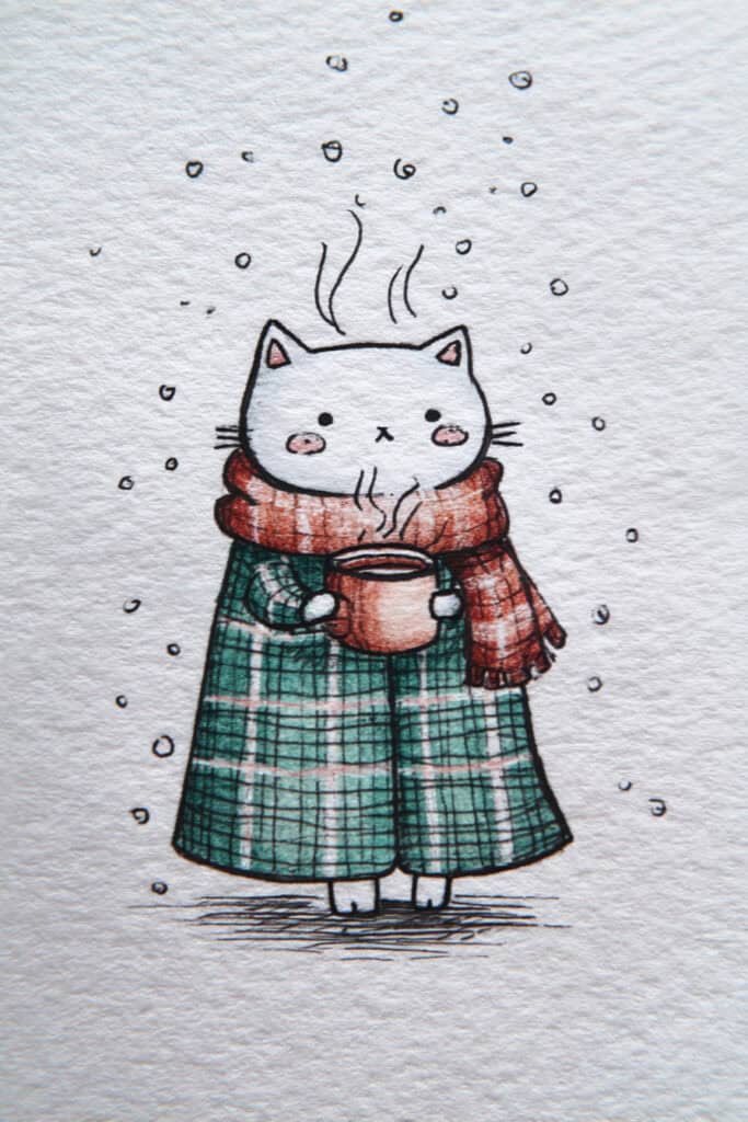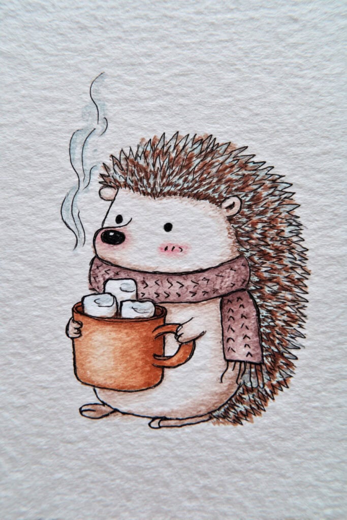 Hedgehog holding a mug of cocoa topped with marshmallows, wrapped in a tiny scarf. Hedgehogs are basically spiky potatoes, which makes them perfect for doodles. The mug should be proportionally too big for the hedgehog to logically hold – that’s part of the charm. The scarf wrapped around adds that cozy factor.