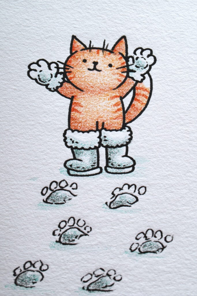 Cat with puffy mittens and fluffy boots, leaving paw prints in the snow. Walking poses with visible footprints create a sense of journey and movement. The puffy mittens make the paws look extra round and soft.