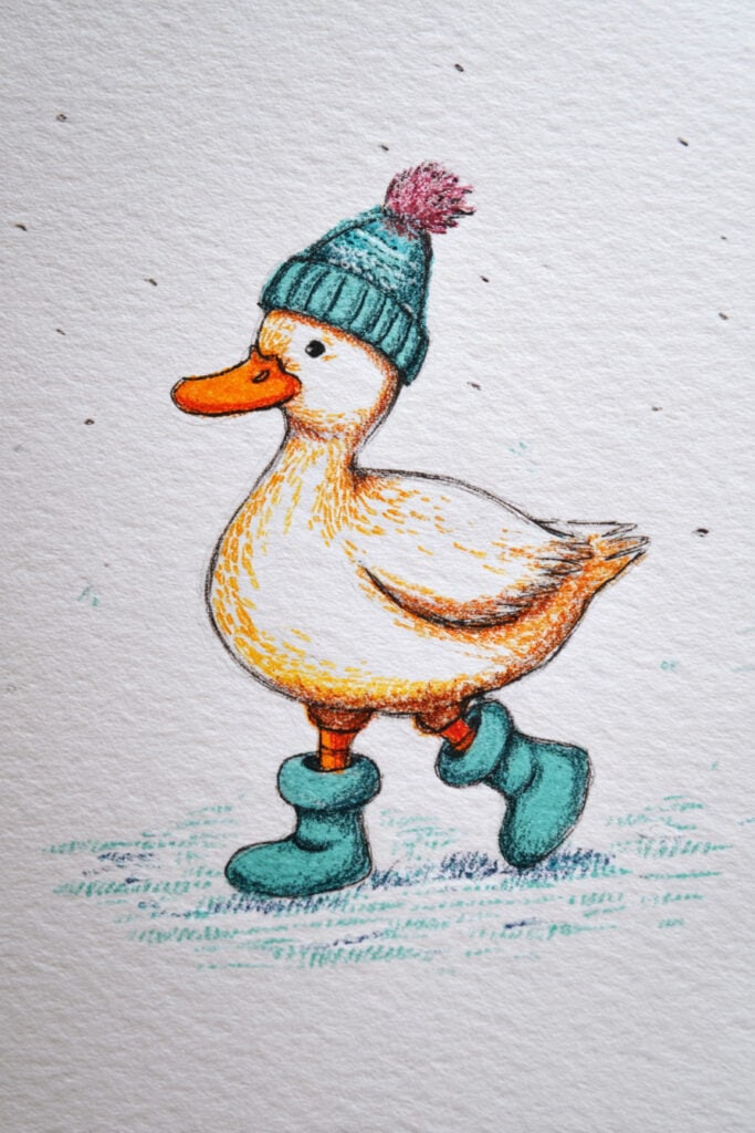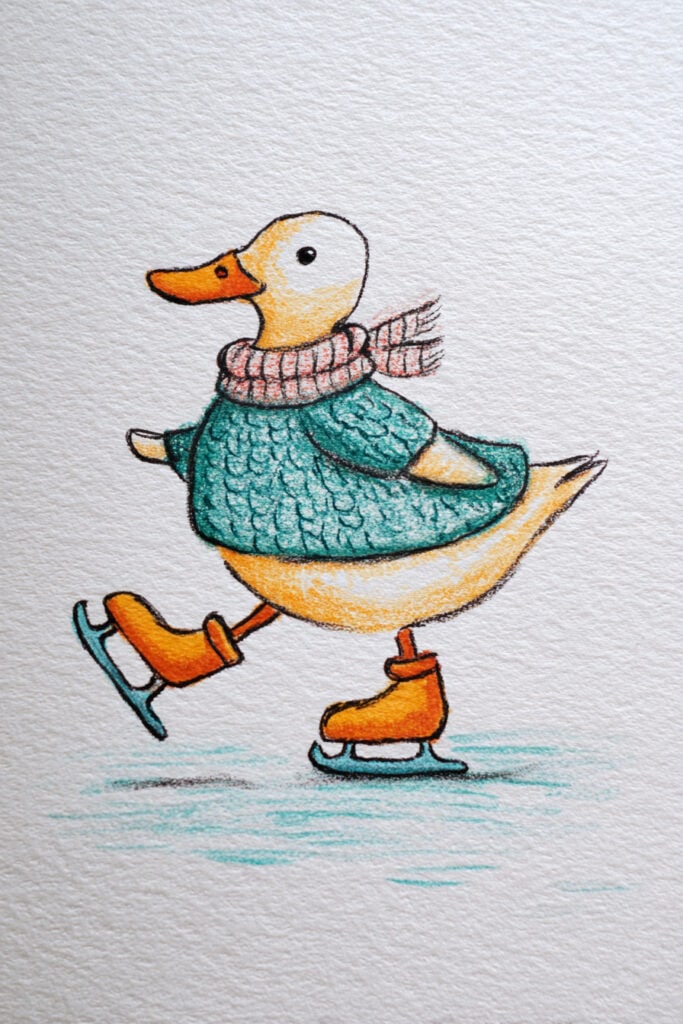 Duck sliding across ice wearing a knitted poncho and tiny skates. Action! The body leaning forward, wings out for balance, that sense of gliding motion – you’re learning to suggest movement in a static drawing. The poncho flowing back reinforces the sense of speed.