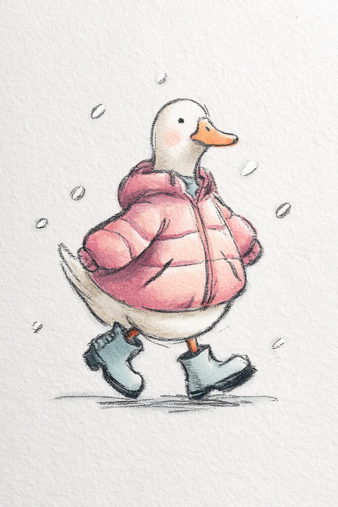Duck waddling in a small puffer jacket and boots. Puffer jackets on birds are objectively hilarious – all that padding makes them even rounder. The waddle pose captures that characteristic duck movement.
