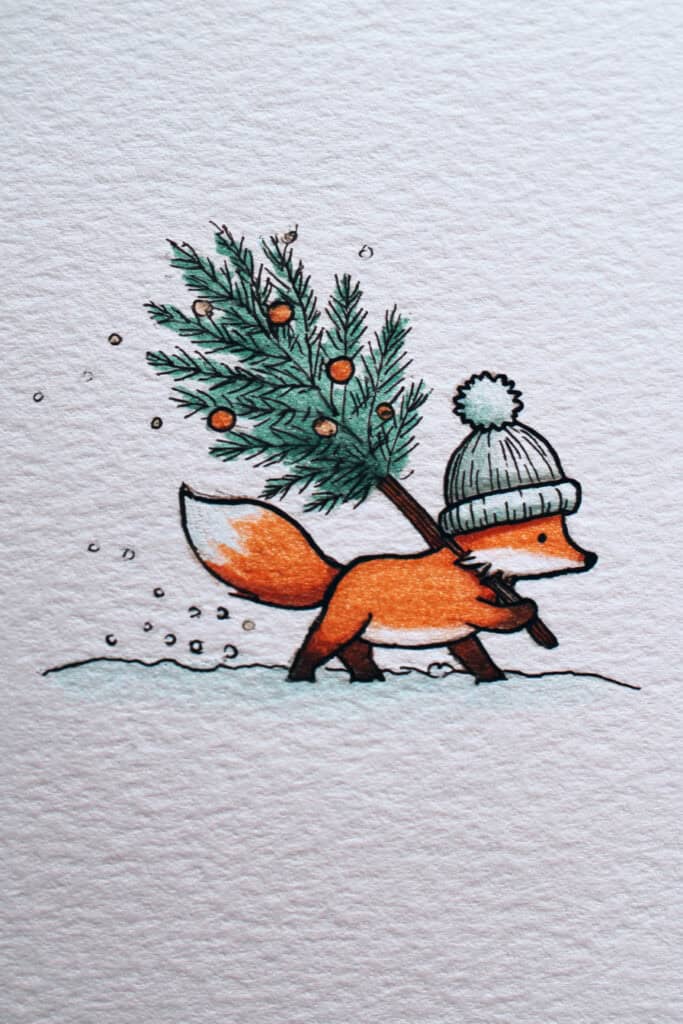 Fox dragging a tiny decorated tree through snow, wearing a pom-pom beanie. The lean forward, the effort of pulling, the tree trailing behind – this is gesture drawing disguised as a cute doodle. The pom-pom beanie bouncing from the movement adds extra charm.