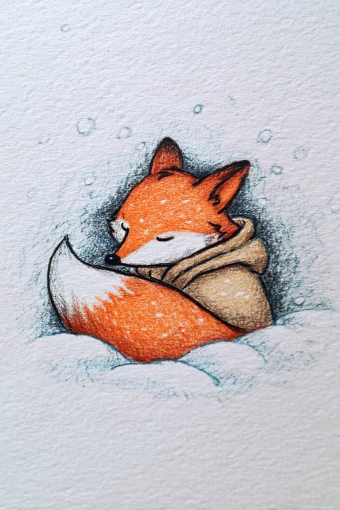 Fox wearing a fleece hoodie, curled up in a snowy nook. Curled-up poses are great for doodles because they’re naturally compact and fit nicely in a sketchbook. The hood adds extra coziness – maybe it’s up, maybe it’s down, maybe the fox’s ears are poking through holes in the hood.