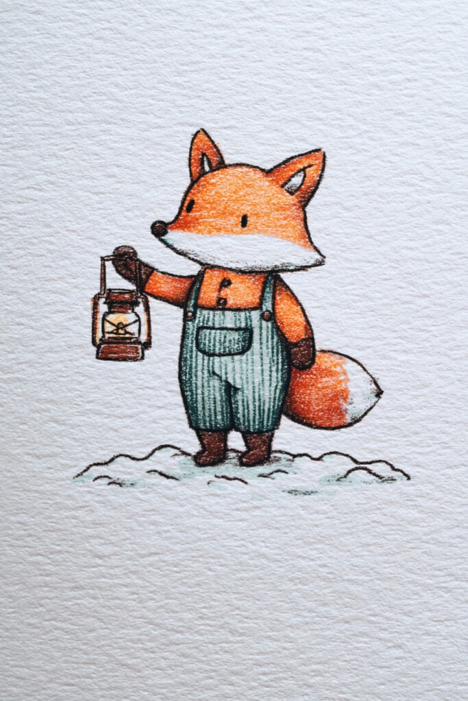 Fox wearing corduroy winter overalls, holding a little lantern, standing on fresh snow. Overalls on animals are hilarious and adorable. The straps, the pockets, the way they fit over a fluffy tail – every detail is an opportunity for cuteness. The lantern adds a focal point and suggests a story (where is this fox going with its lantern?).