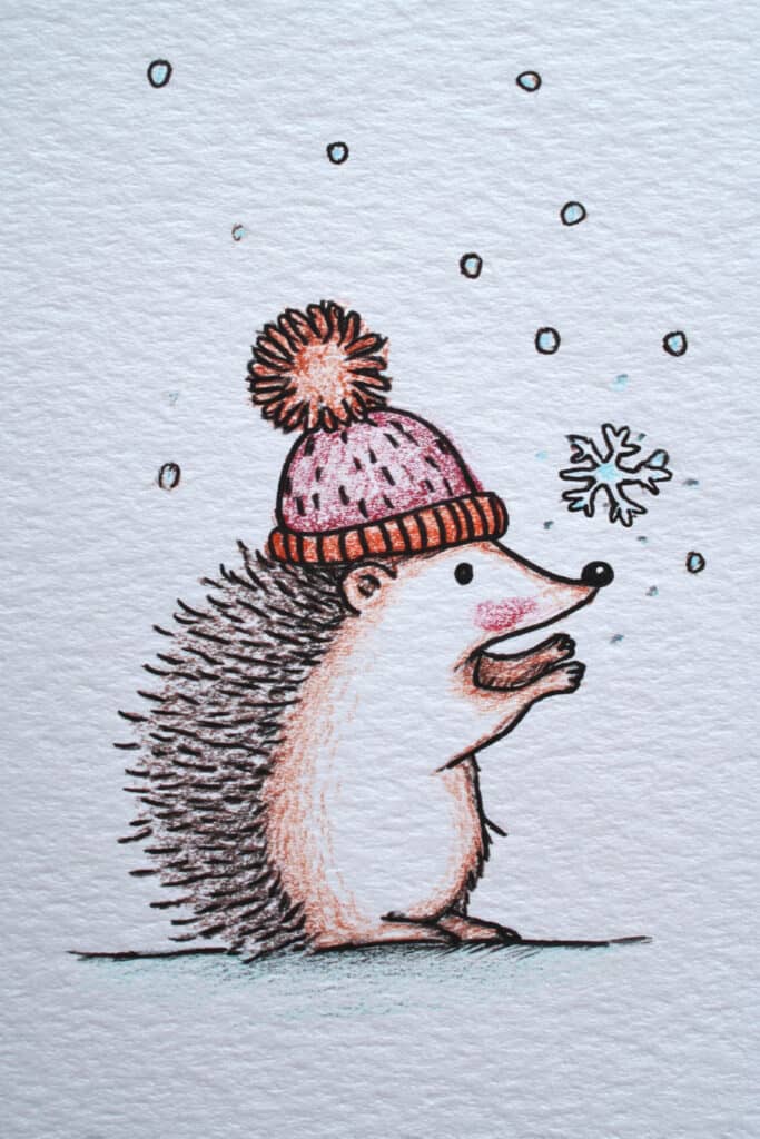 Hedgehog wearing a pom-pom winter hat, happily catching snowflakes on its paws. The reaching-up pose with paws extended is more dynamic than a static sitting pose. The snowflakes give you a reason to practice drawing gentle falling snow without it looking like a blizzard.