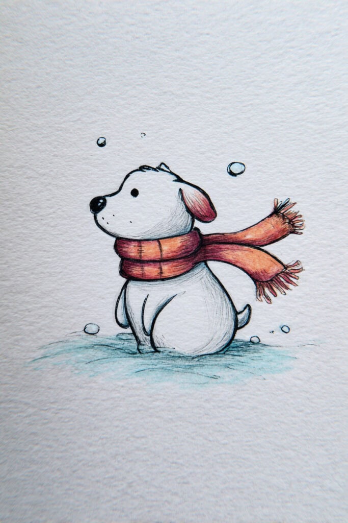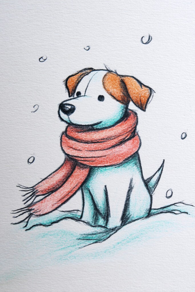 Puppy wrapped in an oversized scarf that trails on the snow. The scarf being comically large is the whole point. When drawing oversized accessories, make them REALLY oversized – commit to the joke. A scarf that’s just slightly big isn’t as charming as one that’s ridiculous.