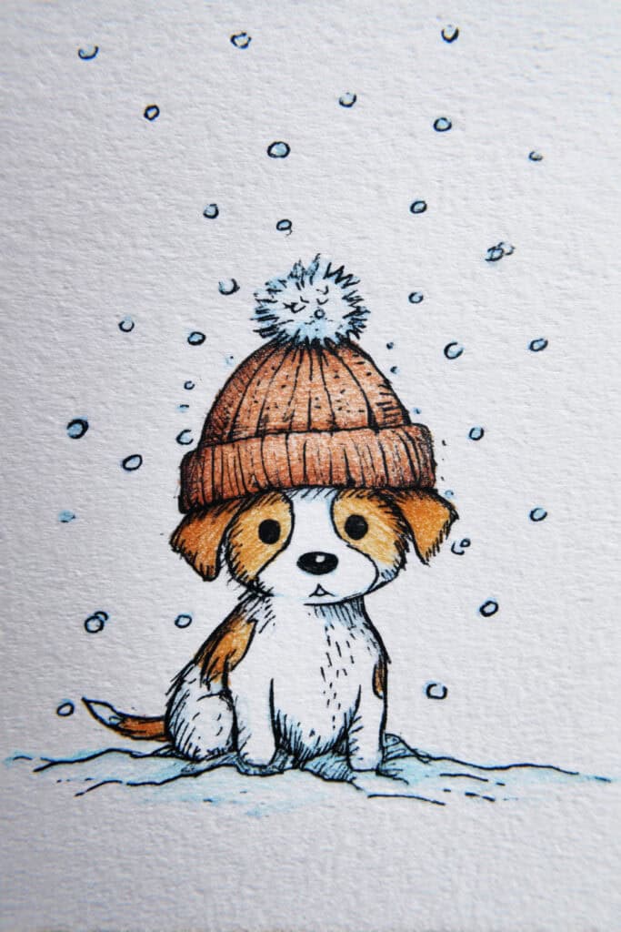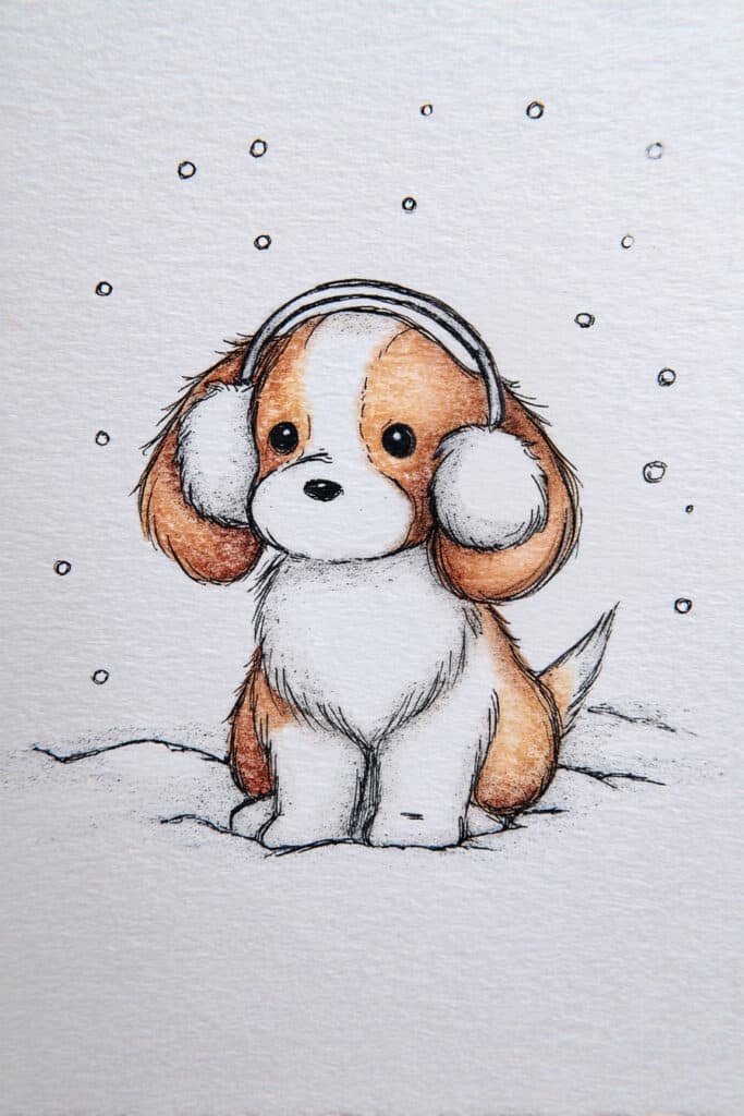 Puppy wearing oversized fluffy earmuffs, sitting in soft snowfall. This was my introduction to drawing earmuffs, which are basically two circles connected by a band – simple in concept, surprisingly tricky to make look natural on a round puppy head. The key is making the earmuffs slightly too big, which increases the cute factor exponentially.