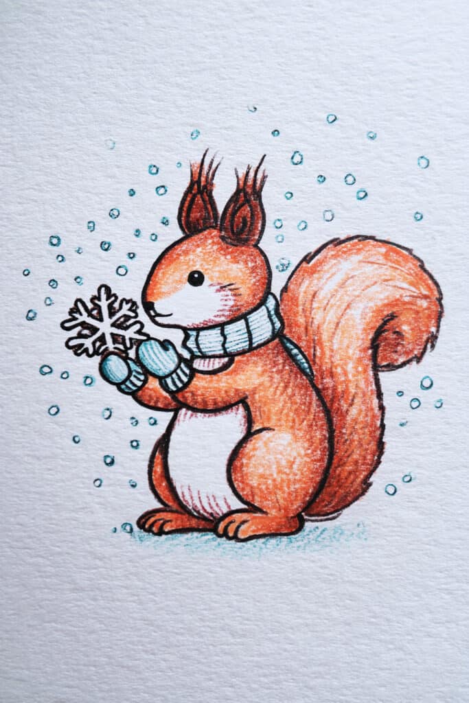 Squirrel wearing mittens, holding a snowflake-shaped cookie, surrounded by sparkly snow. The mittens mean the squirrel can’t really grip things properly, which is both impractical and adorable. The cookie adds a food element (everything’s cuter with snacks).