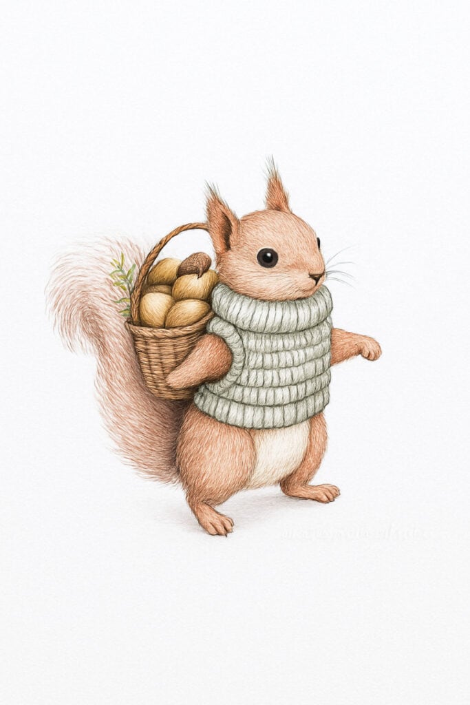 Squirrel carrying a basket of “winter acorns” wearing a fluffy winter vest. The basket adds a prop that tells a story about preparation and gathering. The vest is a different kind of winter wear – good practice for variety.
