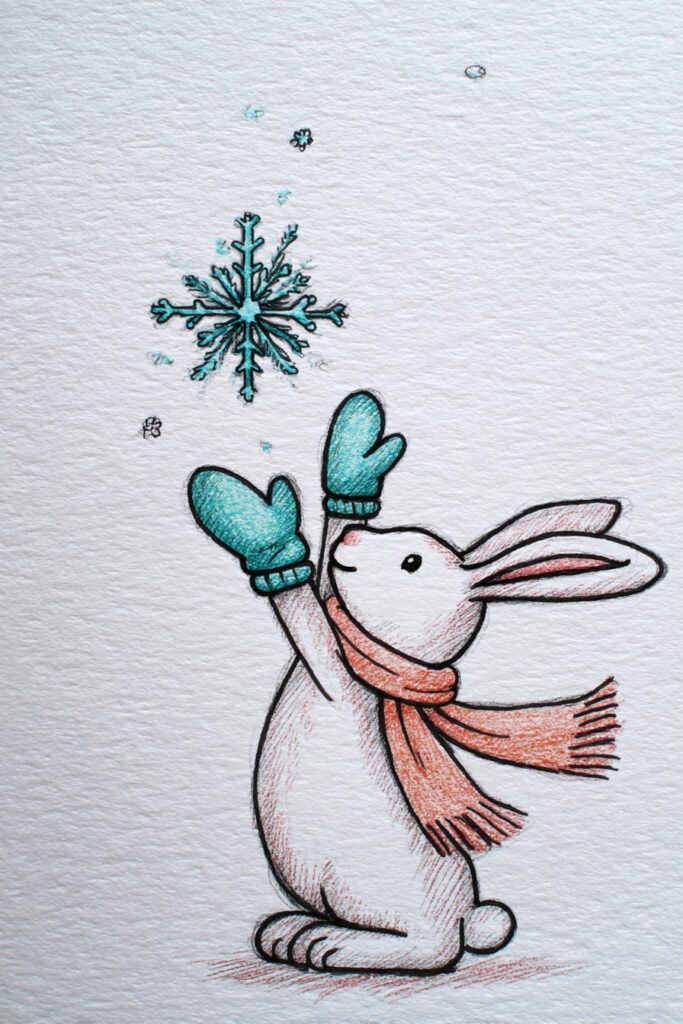 To spark inspiration, imagine sketching a fox wrapped in a scarf, a penguin holding a warm drink, a bunny peeking out of a snow-covered burrow, or a bear napping under falling snow. You could also draw a squirrel gathering winter treats or a cat watching snowflakes from a window. These scenes are cozy, cute, and perfect for winter-themed creativity.
