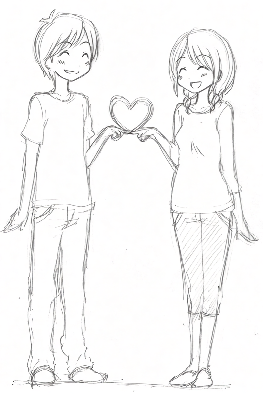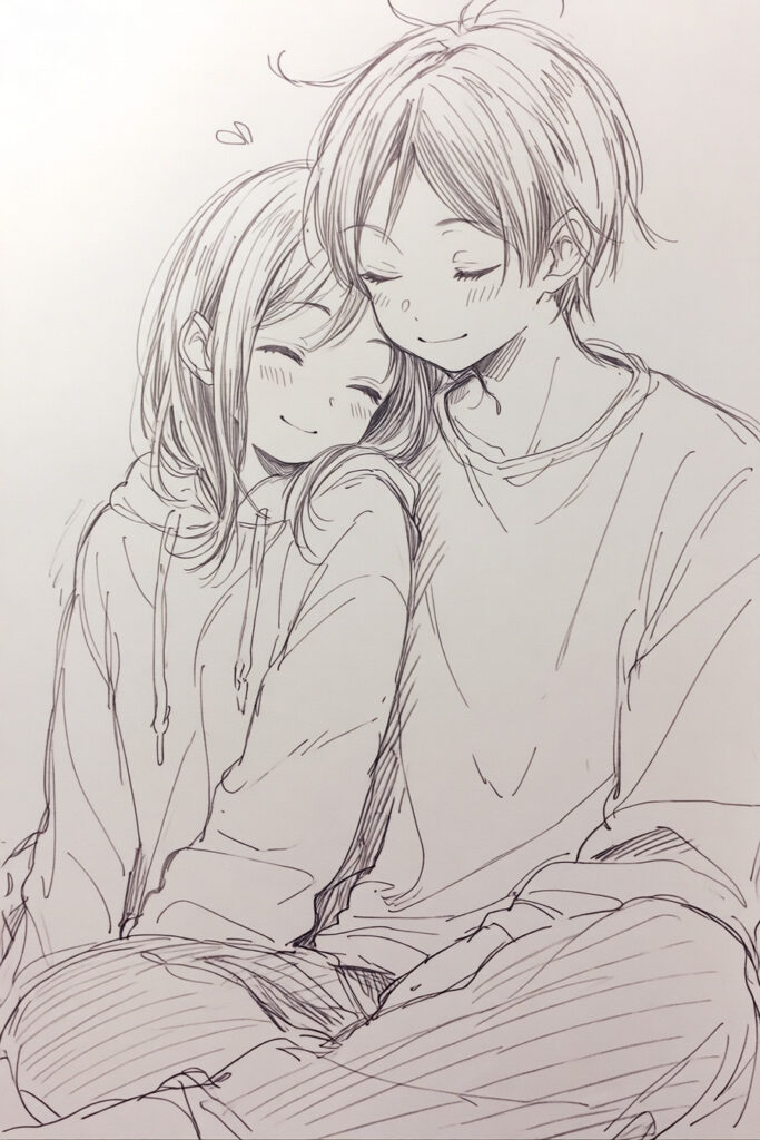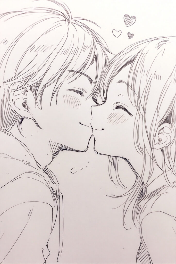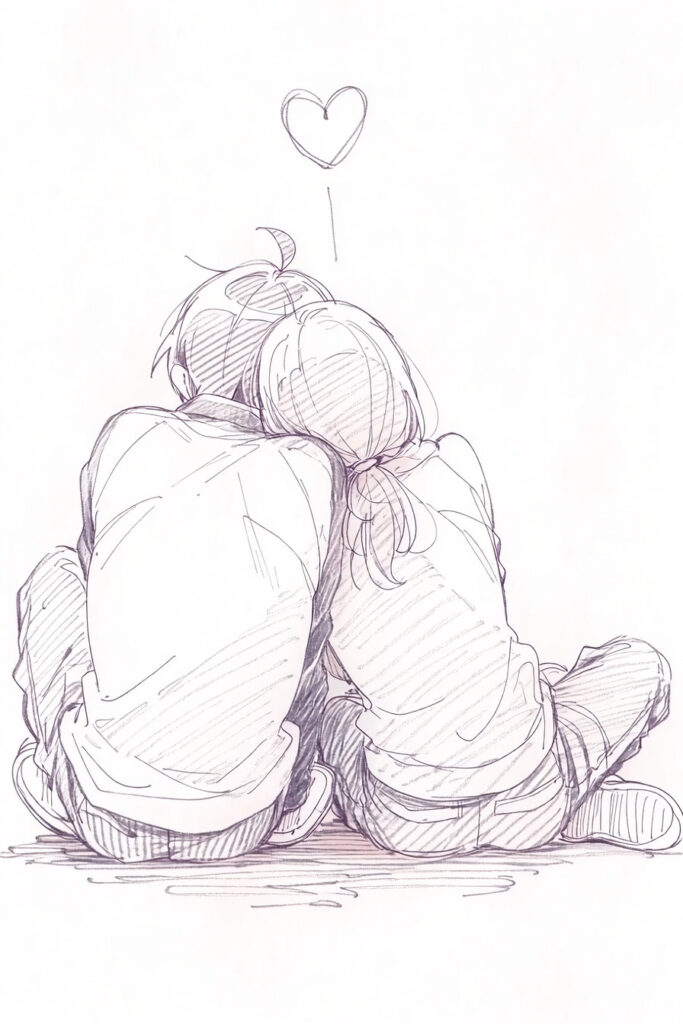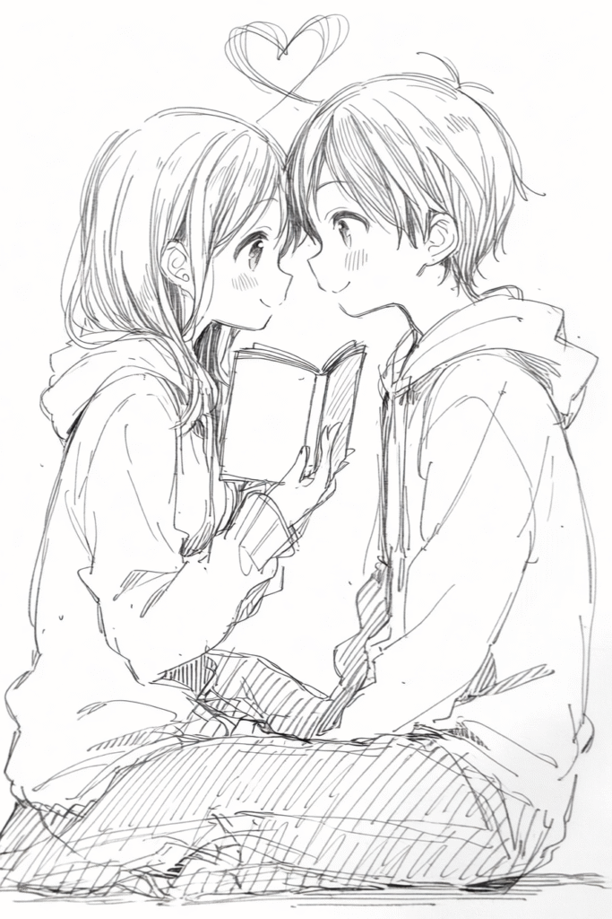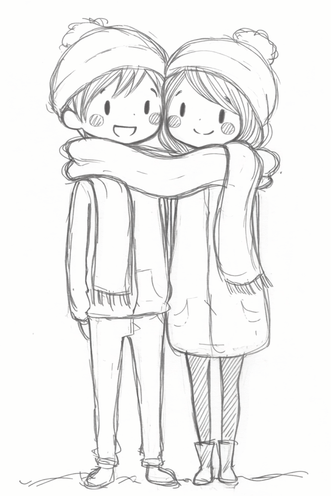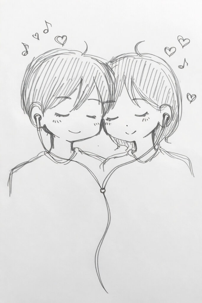 The Valentine sketches in this post focus on gentle emotions rather than bold gestures. They’re inspired by calm, hand-drawn moments: shy smiles, close glances, and the feeling of being comfortable with someone you care about. You don’t need advanced drawing skills to create that mood. You just need to slow down.