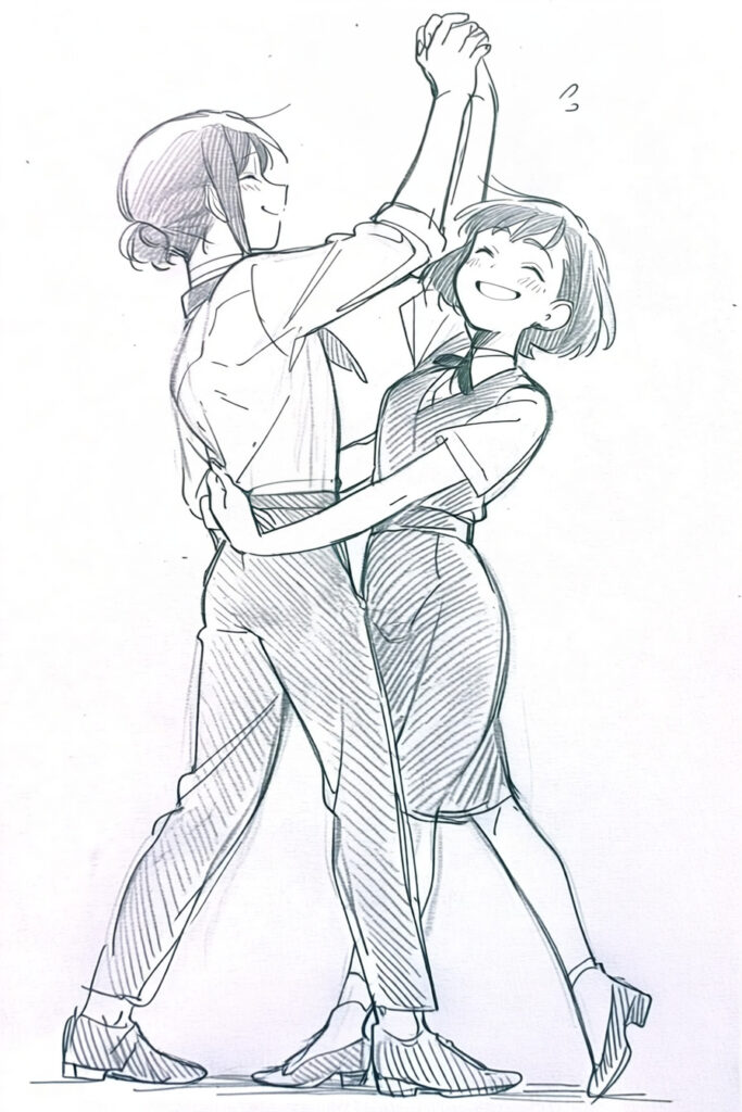 Lying on the grass, holding faces softly, stretching arms outward — relaxed poses that are easier to draw and emotionally effective.