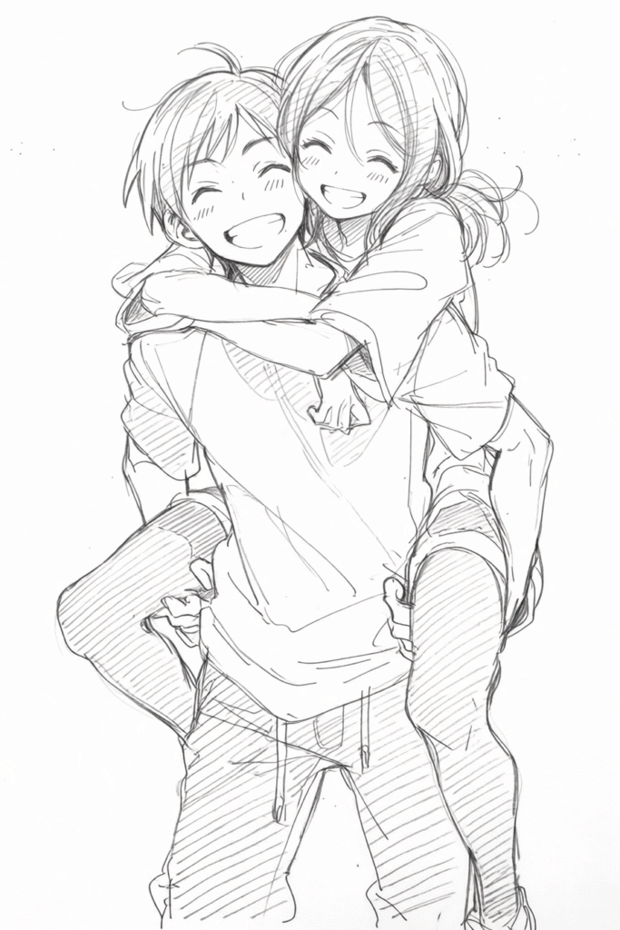 Closed eyes, small smiles, slight blush marks. A few lines are enough to suggest warmth and affection.
