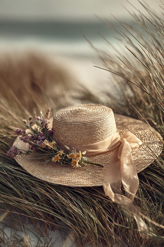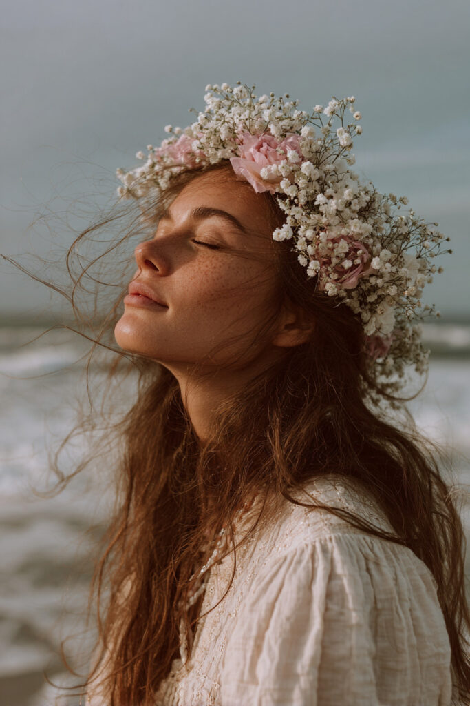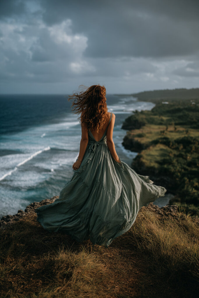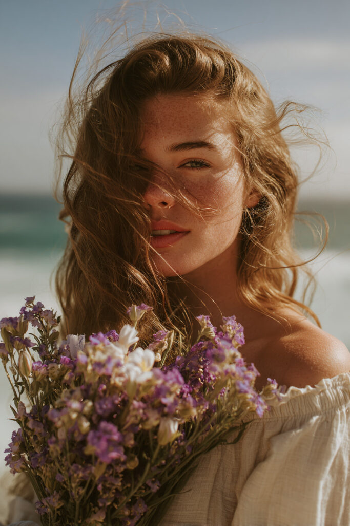 The coast blends natural beauty with effortless style. Seagrass and Sunhat Still Life, Beach Jewellery Styling, and Cliffside Flower Crown combine organic textures with soft styling. Coastal Wildflower Portrait and Cliff Overlook scenes offer a balance of human presence and natural grandeur.
