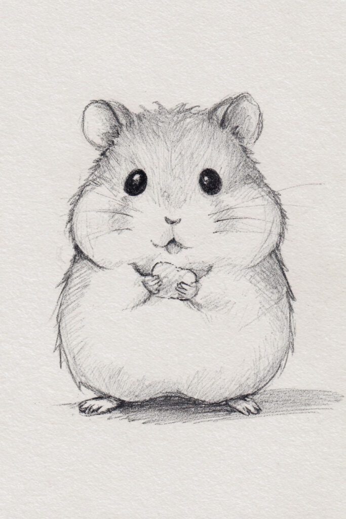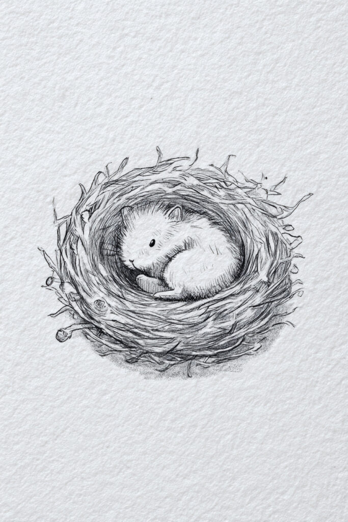 Simple body positions keep these drawings beginner-friendly. Try rounded poses like Hamster in Circle Nest, Bunny Lying Flat, or Cat Curled into Ball. These shapes are forgiving and easy to build from basic circles.