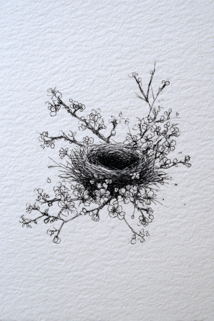 A pen and ink artist once described drawing a simple Bird Nest with Wildflowers during a particularly busy season of life. She chose ink intentionally. No erasing. No rushing.