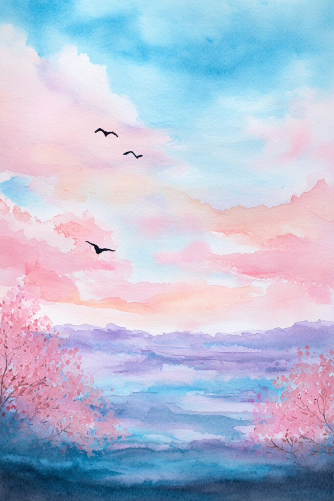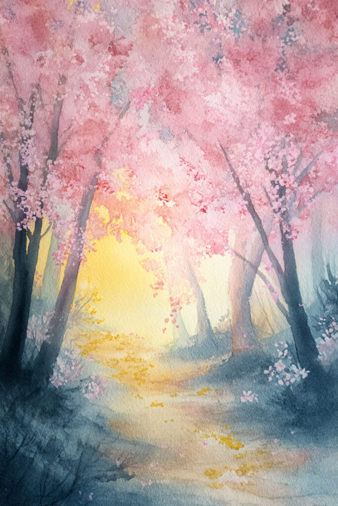 Cherry blossoms are nature’s gift to watercolor artists. Their soft, fluffy shapes and delicate pinks forgive wobbly brushes and happy color bleeds. These cherry blossom spring watercolors focus on loose petals, gentle gradients, and atmospheric backgrounds—so even your first try looks stunning.