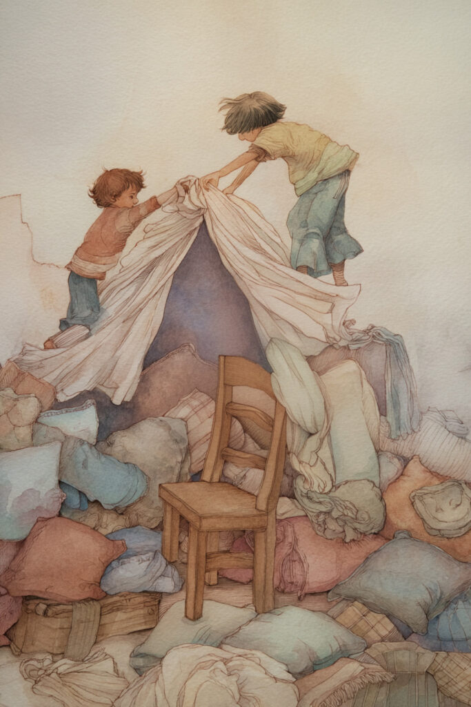 Two children drag couch cushions and blankets into an elaborate fort, chairs propping up the roof, pillows spilling everywhere in the organised chaos of construction. The collaborative energy of this scene — two children mid-project, entirely absorbed, completely in charge — makes it one of the most satisfying pieces of nostalgic illustration inspiration in the collection. This is book illustration at its most architectural and domestic.