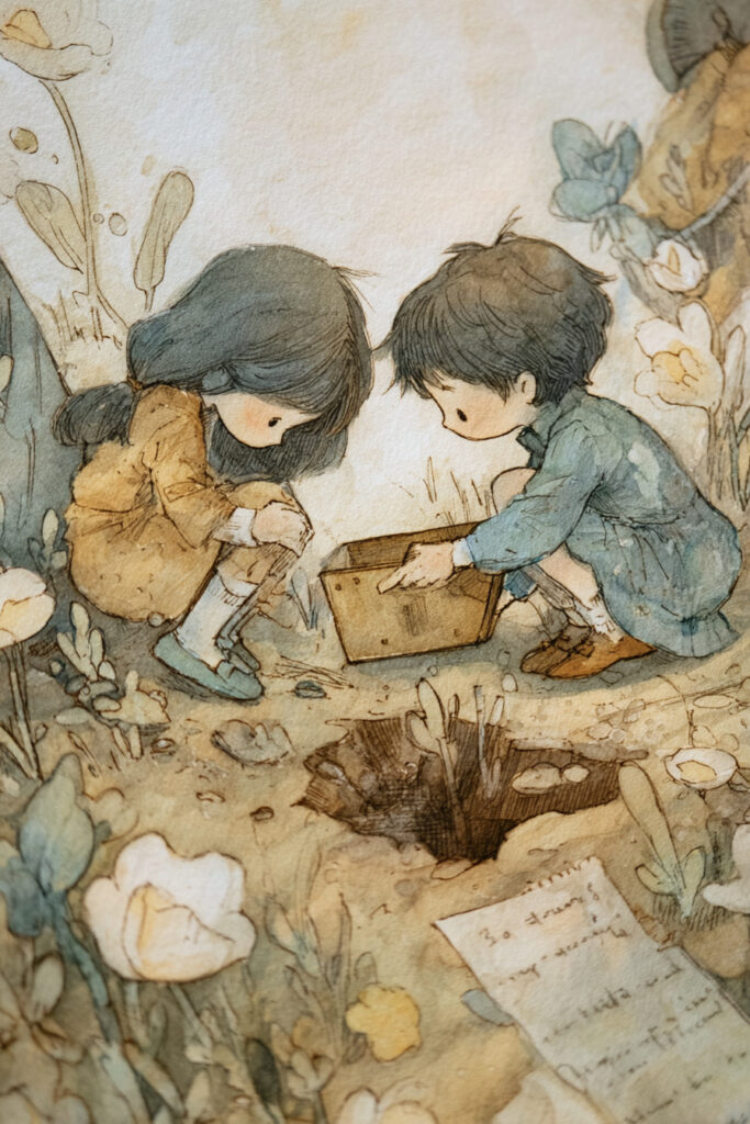 Two children crouch in the garden, carefully lowering a tin box into a freshly dug hole, a handwritten note folded on top. The seriousness and ritual of the moment — the careful lowering, the folded note — make this one of the most quietly powerful book illustration ideas in the set. This is children’s book art at its most tender: two small people taking the future very seriously.