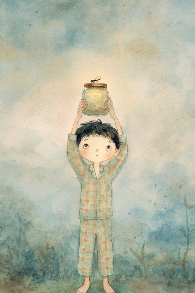 A child in summer pyjamas stands in the backyard at dusk, jar raised above their head, one firefly almost inside, eyes wide with the effort and the hope. The soft dusk light, the glow of the firefly, the child’s pure concentration — this is vintage storybook drawing at its most atmospheric. The scene captures something essential about childhood summer evenings: that feeling of reaching for something luminous and barely-there.