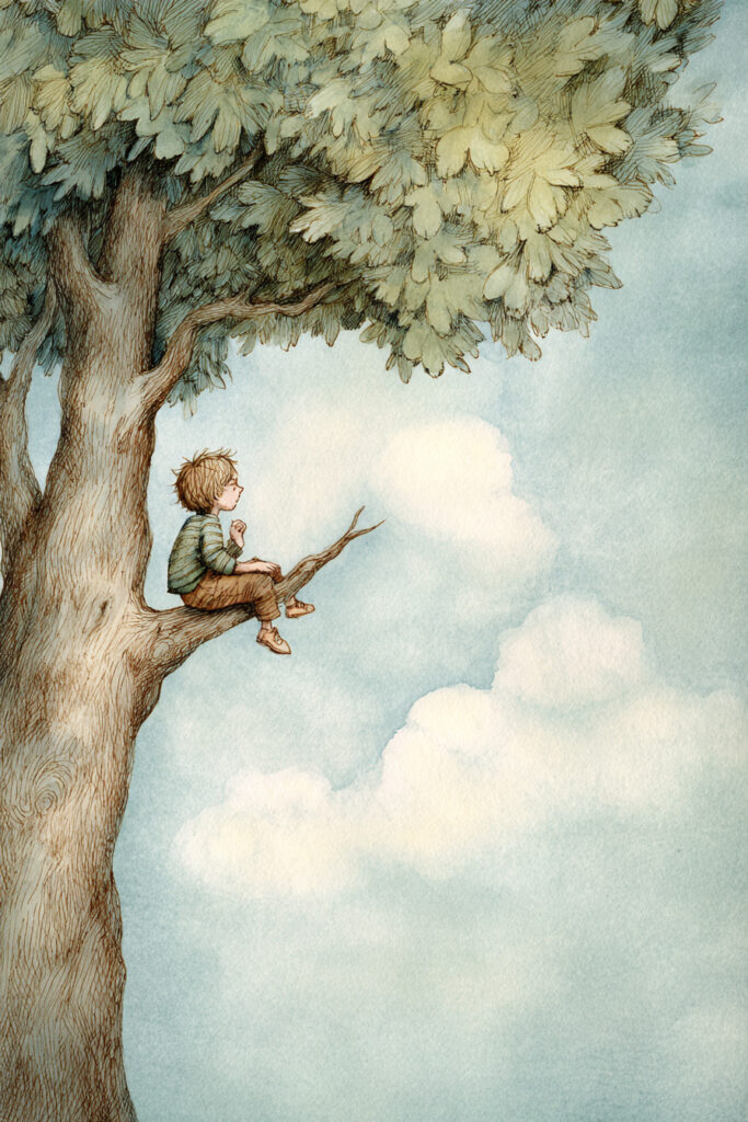 A child sits high up in a wide old tree, one leg dangling, peering through the leaves at something far below, completely at home in their elevated perch. The sense of height, the dappled light, the child’s easy confidence — this is classic book illustration territory, the kind of scene that appears in the nostalgic illustration inspiration of a hundred beloved storybooks, and with good reason.