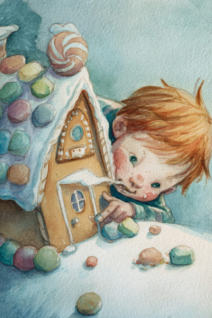 A child leans over a wonky gingerbread house, placing a candy on the roof with extraordinary care, icing smeared on their chin and cheek, fully absorbed in the task. The detail of the smeared icing — the evidence of tasting along the way — gives this scene its warmth and honesty. One of the most festive and detail-rich book illustration ideas in the collection, and a natural fit for classic book illustration styles at Christmas.