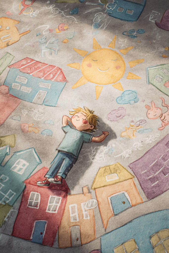 A child lies flat on the pavement, completely surrounded by colourful chalk drawings of houses, suns, and animals, mid-stroke on a new creation. The bird’s-eye composition — the child at the centre of their own drawn world — makes this one of the most visually inventive book illustration ideas in the set. The chalk drawings within the illustration become their own tiny illustrated book art, a drawing inside a drawing.
