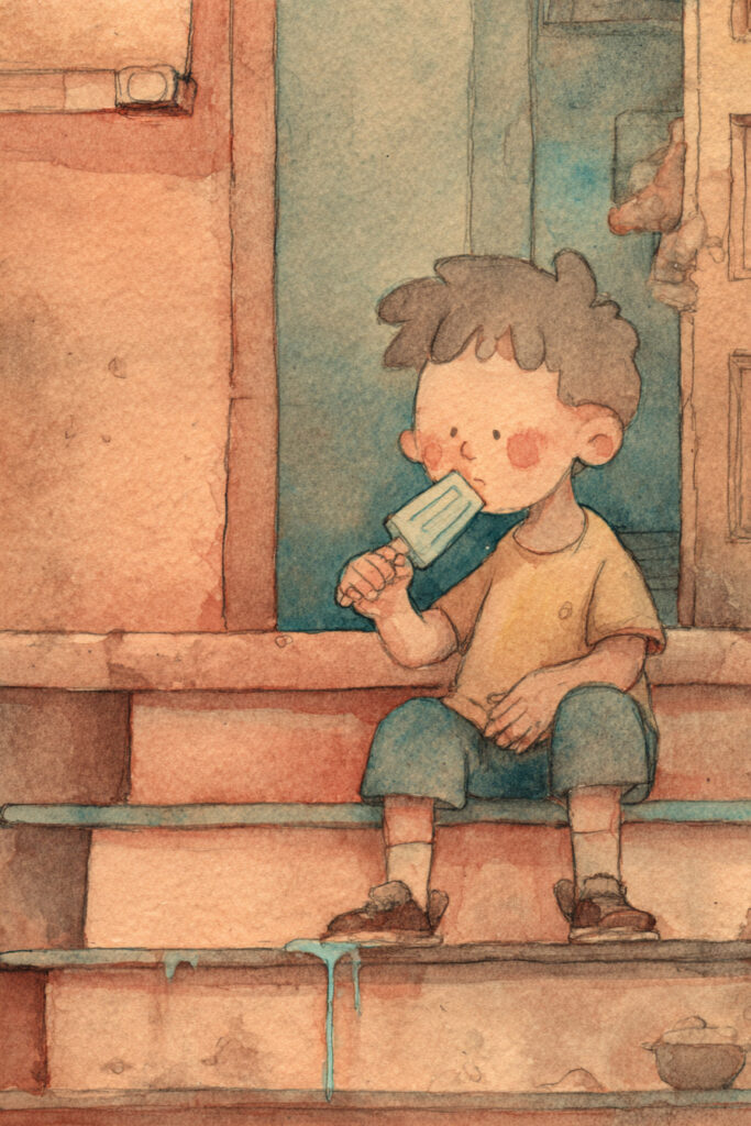 A child sits on porch steps on a hot summer day, a popsicle melting faster than they can eat it, sticky drips running down their hand and onto their wrist. The race-against-time quality of this scene — the inevitable melting, the child’s cheerful resignation — is one of those tiny, specific childhood experiences that every illustrated book art collection should include. Instantly relatable vintage storybook territory.
