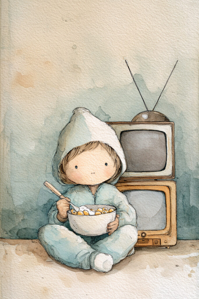 A child in oversized pyjamas sits cross-legged on the floor in front of an old boxy television, a giant cereal bowl in their lap, spoon suspended mid-air. The slightly-too-large pyjamas, the antiquated television, the absorbed, slack-jawed expression — every detail in this vintage storybook drawing earns its place. This is the illustrated book art of pure, unscheduled freedom: Saturday morning, nowhere to be, cartoons on.