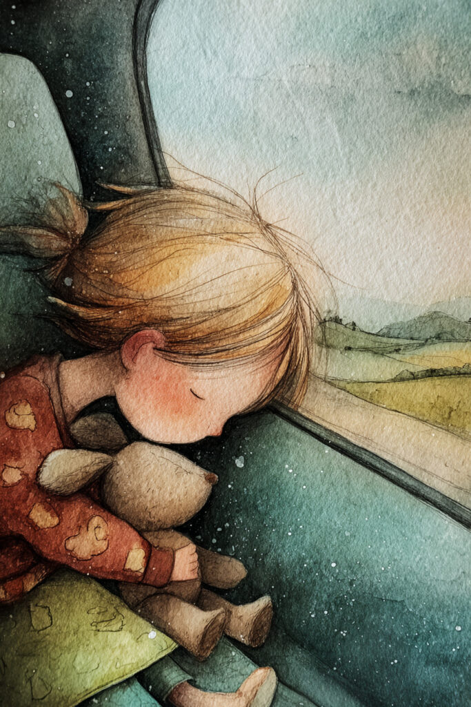 A child slumps against a car window, cheek pressed to the glass, a favourite stuffed animal tucked under one arm, the countryside blurring softly past outside. The tenderness of this scene — the child utterly unaware, the animal tucked close by habit — makes it one of the quietest and most emotionally affecting book illustration ideas in the collection. A masterclass in stillness.