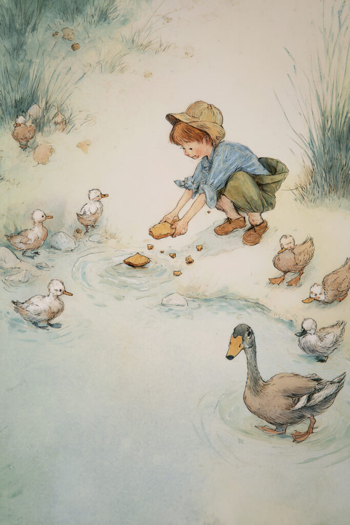 A child crouches at the edge of a pond, tossing torn pieces of bread to a crowd of eager ducks waddling toward them, one duck nearly at their feet. The low crouch, the outstretched hand, the approaching ducks — this is classic book illustration territory, gentle and generous, capturing a small act of cross-species kindness that has been part of childhood for generations. One of the most timeless book illustration ideas in this collection.