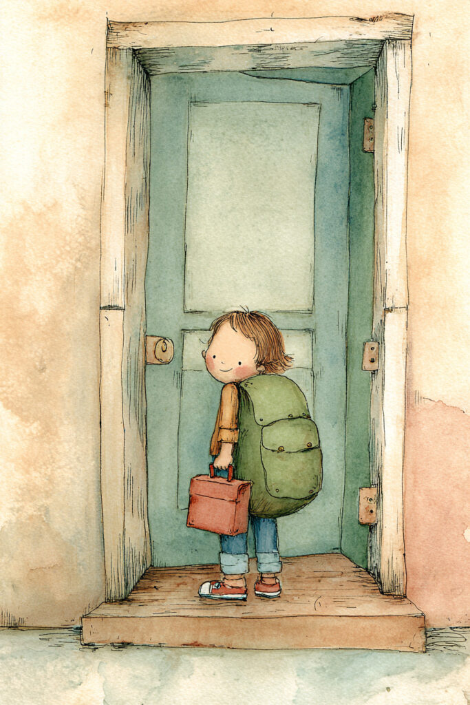 A small child stands at the front door wearing a backpack so large it nearly tips them backwards, lunchbox swinging, a nervous smile on their face. The scale comedy of the enormous backpack against the tiny child is perfect children’s book art — instantly funny, immediately relatable, and carrying a whole world of first-day feeling in a single image. One of the most shareable book illustration ideas in this collection.