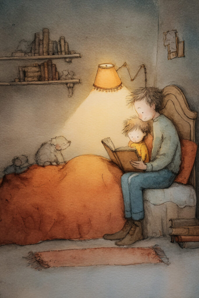 A child is tucked snugly into bed, eyes growing heavy, as a parent sits on the edge of the mattress reading aloud from a thick, well-worn book by the warm light of a bedside lamp. This is one of the most layered and quietly moving book illustration ideas in the entire collection — a scene of comfort, closeness, and the particular magic of a story read aloud at the edge of sleep. It is, in a sense, an illustration about illustration itself.