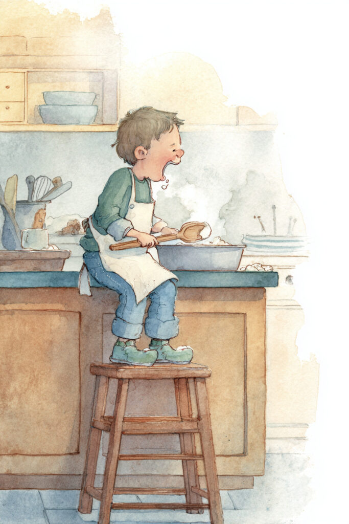 A child stands on a step stool at the kitchen counter, gleefully licking cake batter from a large wooden spoon, apron dusted in flour, entirely in their element. The step stool is the key detail here — the child has had to climb up to reach the counter, to enter the adult world of baking, and is rewarded with the very best part. Warm, funny, and full of personality, this is children’s book art at its most immediately loveable.