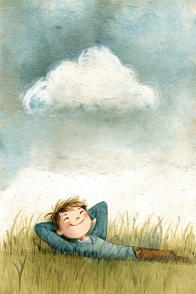 A child lies in a field of grass, hands behind their head, squinting up at the sky, one arm raised to point at a cloud formation they have just named. The horizontal composition, the open sky above, the child’s unhurried contemplation — this is quiet, still, and perfectly composed. A beautiful piece of children’s book art for conveying imagination and the luxury of unscheduled time.