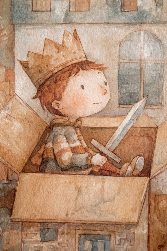 A child sits inside a large cardboard box decorated as a castle, wearing a paper crown, holding a paper towel roll sword, completely in character and utterly committed to the role. The homemade quality of every element — the crayon battlements, the paper crown, the kitchen roll sword — is what gives this scene its power. Among the most imaginative and charming book illustration ideas for celebrating children’s inner lives.