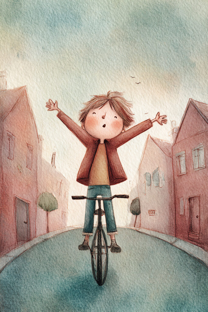A child on a bicycle stretches both arms wide open, head tipped back with a huge grin, a quiet neighbourhood street falling away behind them. This is freedom illustrated — the specific, hard-won freedom of a child who has finally cracked the trick of no hands, and is doing it for the first time without fear. One of the most triumphant book illustration ideas in the collection.