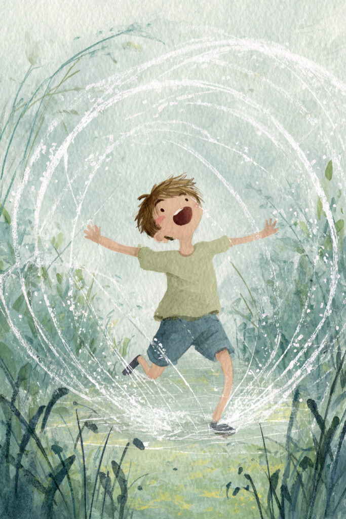 Illustrator’s tip: For outdoor scenes full of movement, sketch your line of action first — that single diagonal that tells you the direction energy is travelling. A child leaping into a puddle, a child on a no-hands bike, a child running through a sprinkler — all of these should have one clear, unambiguous line of action before you add a single detail. Without it, even a well-drawn scene can look static.