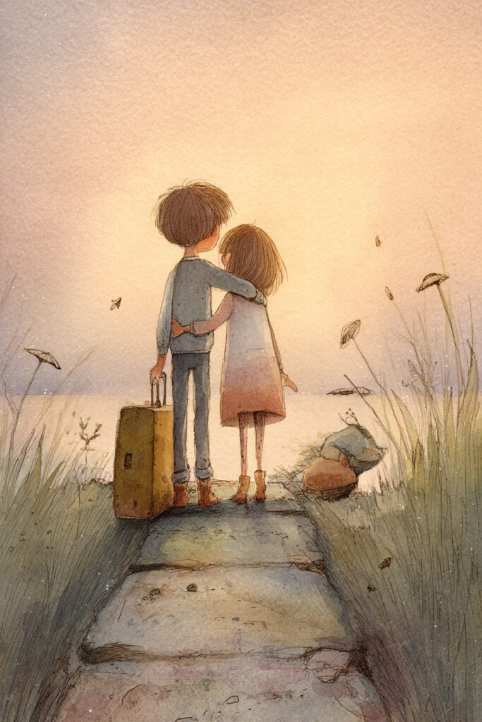 Two children stand at the end of a garden path at dusk, mid-hug, one with a suitcase beside them, the last light of summer fading behind them. This final book illustration idea is also the most quietly heartbreaking. No action, no drama — just two children holding on for a moment longer than they need to, the long summer ending in the particular way that childhoods end: suddenly, and not quite yet. The perfect note to close on.