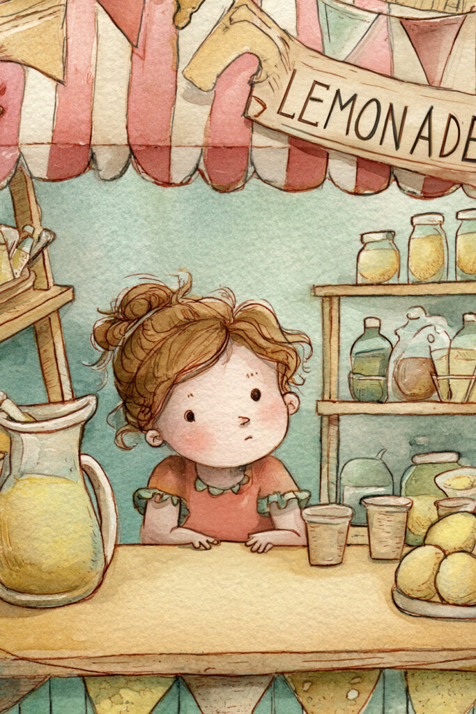 A child stands behind a wobbly hand-painted lemonade stand, a crooked sign above, a pitcher of lemonade and paper cups on the table, a look of pure hopeful enterprise on their face. The hand-lettered sign, the slightly-listing table, the child’s earnest expression — every detail of this classic book illustration style scene earns its place. One of the most universally recognised book illustration ideas for childhood entrepreneurship.