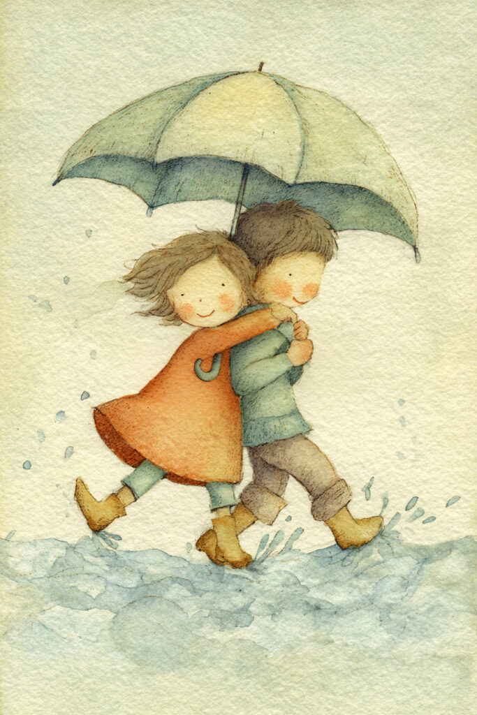 Two children walk under one small umbrella that barely covers them both, one shoulder each getting soaked, both laughing anyway. The lopsided umbrella, the wet shoulders, the laughter — this is nostalgic illustration inspiration at its most generous. Rain as joy rather than inconvenience. One of the most warmly human book illustration ideas in the entire set.