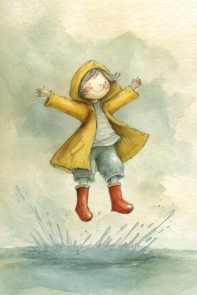 A child leaps with both feet into a giant puddle, rain boots bright and oversized, raincoat hood half-fallen from the impact, pure uncomplicated joy on their face. The mid-air moment — boots leaving the ground, arms flung wide, water exploding in every direction — makes this one of the most kinetic and energetic book illustration ideas in the set. Illustrated book art does not get more joyful than this.