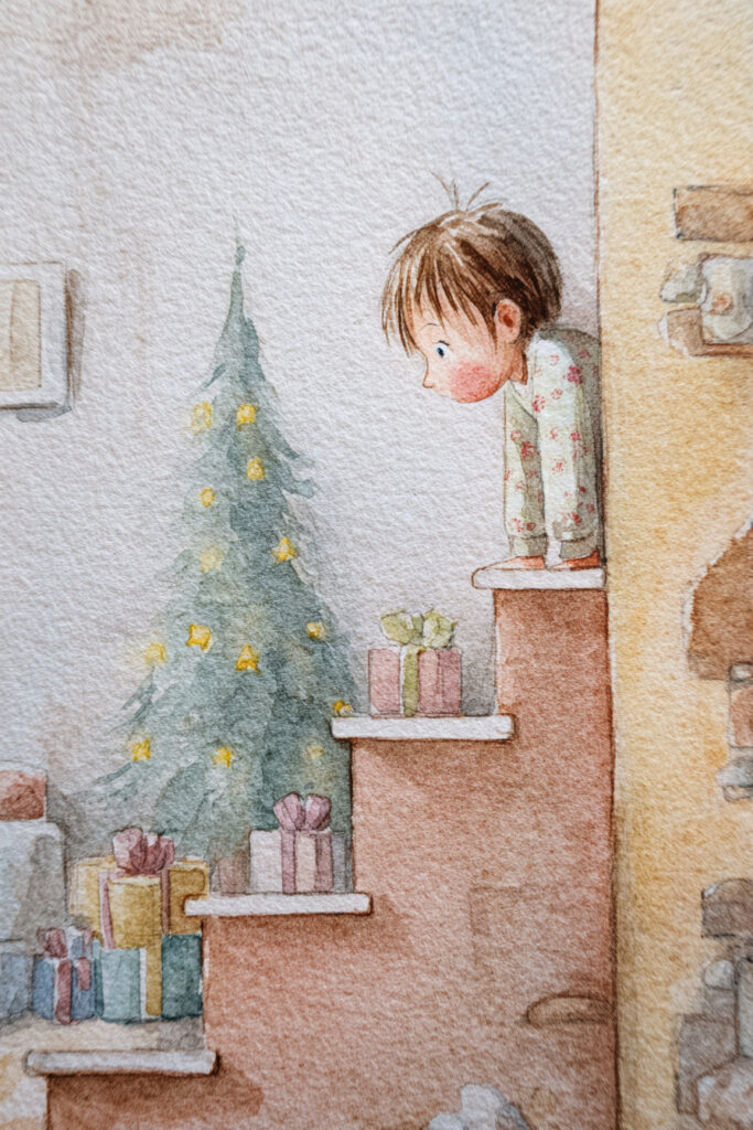A child stands at the top of the stairs in pyjamas, peering wide-eyed down at the living room below, presents and a lit Christmas tree just visible at the edge of the frame. The view from the top of the stairs — the child’s strategic pause before the descent — is one of the great book illustration ideas for capturing anticipation. Everything is about to happen, and this image lives in the single held breath before it does.