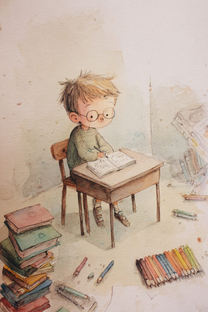A child sits at a small desk, tongue out in concentration, drawing and writing in a stapled-together booklet, crayons and pencils scattered around them in a radius of creative evidence. This is one of the most meta book illustration ideas in the collection — a child making their own illustrated book, rendered as an illustration, for a book about illustration. The scene carries genuine emotional warmth for any illustrator who was once this child.